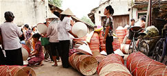 ハノイから車で約1時間のところにあるハータイ(Ha Tay)省チュオン(Chuong)村はご存知?この村はノンラー(Non La/ベトナムの編み笠)作りの村として知られ、村では毎月旧暦の4、10、14、20、24、30日(新暦2007年10月は4、10、14、20、24、30日)に、チュオン(Chuong)寺の境内脇でノンラー市が開かれる。完成品以外にも、制作に使う型や材料も販売。ノンラーを作る各家でお願いすれば、制作現場も見学させてもらえる。