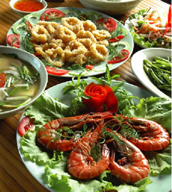 レストランとバー、そして宿泊施設を兼ねた島の丘の上にある「ヴィエットハウスロッジ」は、北部ハザン省の少数民族より買い受けた家を改築したもの。バー&レストランは、宿泊者以外でも気軽に利用することができ、窓の外に広がる真っ青な海と神秘の奇岩群を眺めながら、海の幸に舌つづみ、としゃれこもう。 店名:Viethouse Lodge