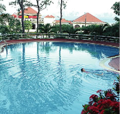 バイチャイの街の中心である郵便局からクルーズ船乗り場へ向かう道の中ほどにあるサイゴンハロンホテル。その敷地内にはハロン湾の景色を眺めながら、のんびり過ごせるプールがある。宿泊者以外も利用可能。料金はホテルの入り口右手にあるレストラン内で支払い。 サイゴンハロンホテル