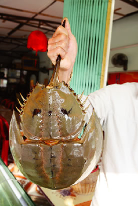 食用のカブトガニ。雄雌のつがいで食すのが慣わし。ちなみに値段は2匹で10万ドン(約760円)