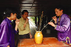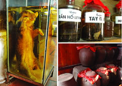 熊が丸ごと漬かっているお酒があるとの噂を聞きつけ、取材に出向いた一軒の酒屋。そこには、それほど大きくないけれど確かに一頭、体長50センチ程の小さな熊が丸ごとそのままお酒の中に。ちょっと標本のようで不気味だけれど、高血圧や胃痛に効果抜群。 中には熊の手だけを漬けたものもあるという。その他にも、大型イモリが入っていたり、鳥の足が漬けられていたりと、飲むには少し勇気がいるお酒がずらりと並ぶ。 同店では、ホアビン省に住むタイ族のお酒「ジオ・カン(Ruou Can)」も置いてある。長い植物の茎をストロー代わりに、大勢の人と一つの甕の中のお酒を飲みあうこのお酒。大型の甕ともなると、約10人分のお酒が入り、飲みごたえも十分。日本ではなかなか飲めないこれらは、下記のお店で勇気ある友人と連れ立ってお試しあれ。 店名:COM LAM PAC BO (2005年5月9日 月曜日 10:35JST更新) |