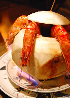 リゾート内には、海岸近くに建てられたオープンエアのレストランがあり、捕れたての美味しいシーフードが食べられる。特にお勧めなのは、大きなエビが盛り付けられた車エビのココナッツ蒸し。飲み物では、ココナッツのミルクシェイクで南国気分を存分に味わいたい。