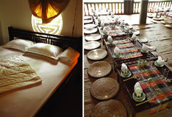 レストランは、ムオン族の高床式の建物で、ベトナム料理が中心。レストランのメニューは、残念ながらベトナム語のみ。だが、ダチョウ料理など一風変わった品もある |