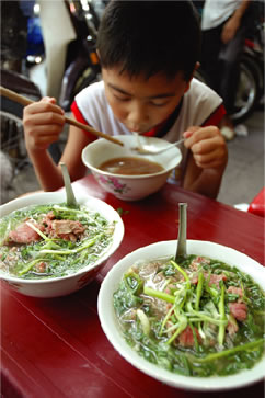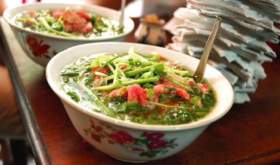 ハノイを代表する朝飯といえば「フォー」。鶏肉フォーと牛肉フォーの専門店にわかれていることが多く、有名店は朝から車やバイクで乗りつける沢山のハノイっ子で大賑わい。そんな中、牛肉フォーで有名なのが、旧市街バッダン通りにあるお店。 大半の店は席に店員が注文をとりに来るのだが、ここはフォーを作っている台の前に並び、そこでお金と引き換えにフォーを受け取る、ちょっと変わったシステム。化学調味料を一切使わない濃い目のスープが特徴で、どの時間帯に行っても行列がズラリ。午前10時くらいで完売となることも多いので、食べにいくなら寝坊は厳禁! 店名:Pho Gia Truyen Trung Vit Lon/チュンビットロン
