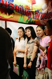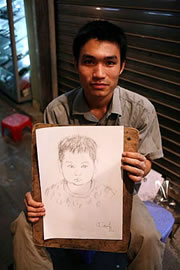 似顔絵 (map 17) ナイトマーケットのあちこちで見かける似顔絵屋。2割増しの美貌に仕上げてくれるので、自信がつくかも。1枚2万ドン(約140円)。 「画家を目指してスキルアップ中です!」