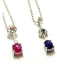 Bスウィングネックレス (写真左)ルビー、サファイヤ、ダイヤモンドをちりばめたネックレス(220US$)。コーディネートのしやすさが魅力。(写真右)サファイヤ&ダイヤのネックレス(200US$)は、シックに楽しみたい1本。