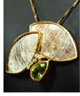 E貝のペンダント 螺鈿として使われる貝の裏側ではなく、あえて貝表面にペリドットを合わせたアーティスティックな1本(885US$)。欧米人に大人気とか。