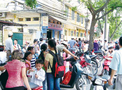 小学校の登下校時には、交通事故を心配して子供を送迎する父兄で校門前があふれかえる。小学校は2部制をとっているところが多く、夕方にもこの人だかりは発生する。学習塾の前でも同じ現象が。 |