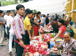 有名な寺院でなくとも、仏教徒の習慣から旧暦の1日と15日は大混雑。お参りグッズを売る門前の露天市にも、この日は人だかりが。法要などもおこなわれるので、この日を狙って行くのもいいかも。 |