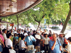 人気の水上人形劇が上演されるタンロン(Thang Long)劇場の前は、客の入れ替え時に大勢の人でごったがえす。ツアーバスやら、観劇終了後の観光客をつかまえようと集まるシクロやらで大混雑だ。