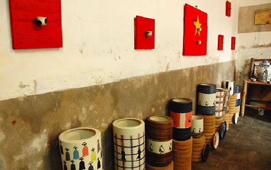 「誰かが、僕の絵はピカソの絵にそっくりだといったんだ。でも、僕はピカソなんて誰だかしらないし、興味もない。自分の思たものを陶器に描くだけだよ」と語るのは、バッチャン村に住むグエン(Nguyen Xuan Nguyen)さん。10年ほど前、この村の芸術家たちとの出会いを機に陶器に絵を描き始め、今ではバッチャン村にギャラリーも兼ねたショップを開く芸術家だ。 作品のテーマはベトナムの貧しい農村。どこか寂しげ、しかしそれでいて大胆な彼の作風は、トンボや菊、井形など、これまでのバッチャン焼きとは違ったモチーフで、現在注目を集めている。彼のショップには、真っ赤な板に貼り付けたお皿、拾ってきた使い古しのまな板に小さな茶碗を取り付けたものなど、バッチャン焼を取り入れた一風変わったディスプレイが施されている。 DELICIOUS CERAMIC [デリシャスセラミック]