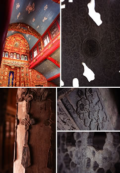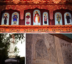 ファットジェムでは、ベトナム人に親近感を持ってもらうため(?)、アオザイを着た聖人たちの姿を所々で見ることができる。少しわかりづらいので、注意深く探してみよう。 (写真上) 本堂の祭壇の上部、キリストの肖像画の両端には、アオザイを着た男女&文官と武官の肖像画が。彼らは実在したベトナム人の聖人なのだそう。<MAP@> (左下) 伝統の家の前にある庭には、アオザイを着たマリア&キリスト様の可愛らしいお姿が。必見です。<MAPG> (右下) 「ヨゼフ(キリストの養父)の教会」にあるレリーフ画に、ベトナム風の衣装を着た人々が。また、ドンホー版画でモチーフとして好まれる「ココナッツの木」が描かれているなど、さりげなく地元文化の影響が感じられる。<MAPD> 見所ポイント四★