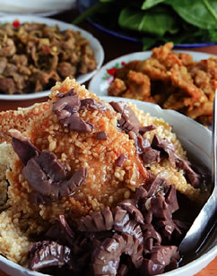 @ファットジェムの歴史 1627年、カトリックの宣教師が船でニンビンに辿り着き、以来ここから紅河周辺にカトリックが普及していった。現在のファットジェム教会は、ベトナム人のチャン・ルック(Tran Luc)神父の指示のもと、1875年から1899年の間に建築された。教会落成後ほどなくして亡くなった彼の墓は、今も鐘の塔と本堂の間に保存されている。 ファットジェム教会 Aレストラン情報 ファットジェムに来たら、ニンビン省名物のおこげ料理「コムチャイ(Com Chay)」はいかが?おすすめはヤギ胸肉のから揚げ(4万ドン/約300円)と、豚モツ入り餡かけごはん(4万ドン/約300円〜)。 Huong Mai(フーンマイ)