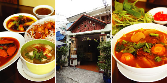 右)セットメニュー:マッシュポテトのフライ[Vien Tuyet Hoa]、鶏肉のソテー[Ga Ran]、ナンタム風豆腐[Dau Nang Tam]、からし菜の炒め[Rau Cai Xao]、蟹とトマトのスープ[Canh Rieu Cua] 住所:79 Bis Dien Bien Phu St., Dist. 1 |