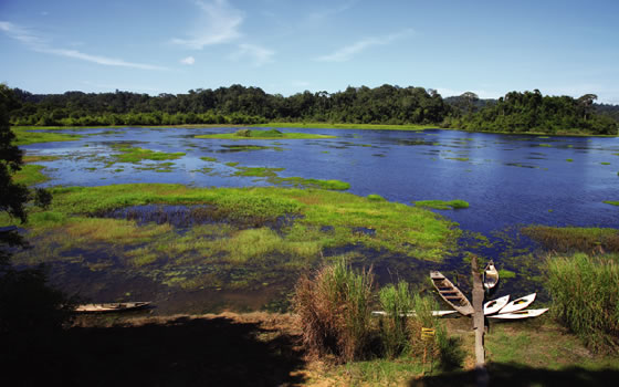 「ワニの沼」を目指してジャングルの中を歩くこと1時間半。目の前に開けるその光景は、まさに驚き、超感動。バードウォッチングにも最適のスポットだ。