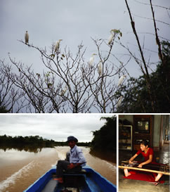 【写真説明】上より ■船からも、鳥や動物の姿が見られる ■村へは船で約45分 ■民族衣装は高価なため普段着られることはないが、衣装作りの技術は今も健在。作られた布は購入できる