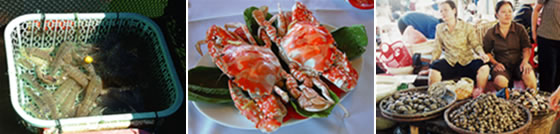 ハロン湾で食事となると、一にも二にも、世界遺産を眺めながら船上で食べる新鮮なシーフードの数々。真っ青な空の下、潮風に吹かれながら頂く海の幸は、まさに絶品。中でもオススメなのが肉厚のカニと、新鮮でほのかな甘味があるシャコ。ぜひ味わって欲しい。なお、ほとんどの遊覧クルーズに、海鮮料理の昼食が含まれている。