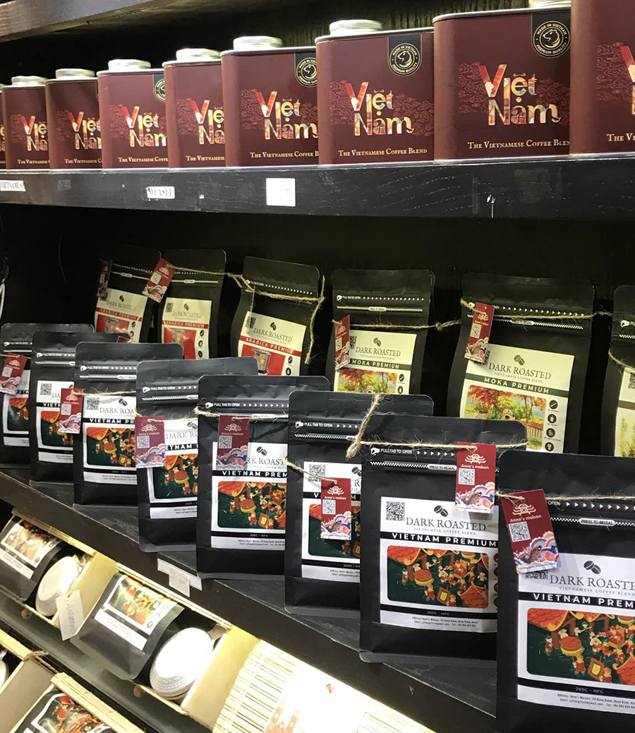 中煎りコーヒー豆を使った商品は、日本人にも大人気。(100g)80万VND