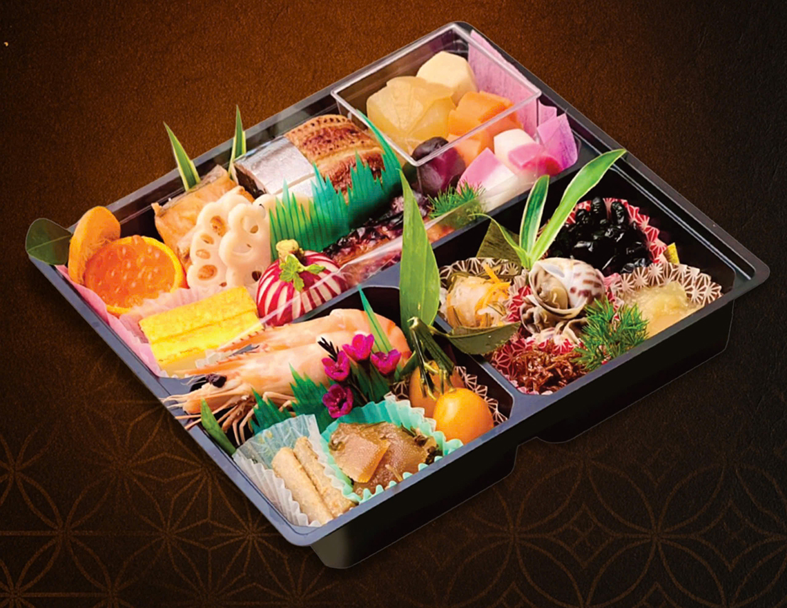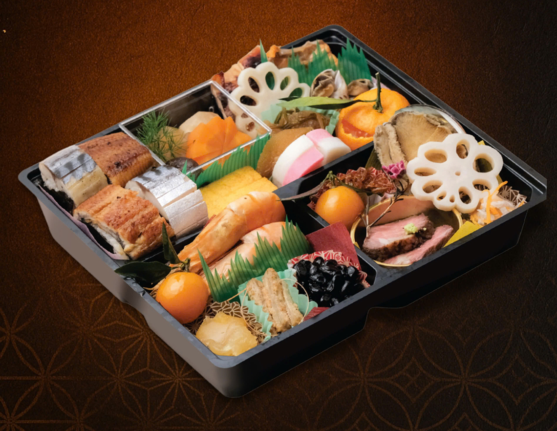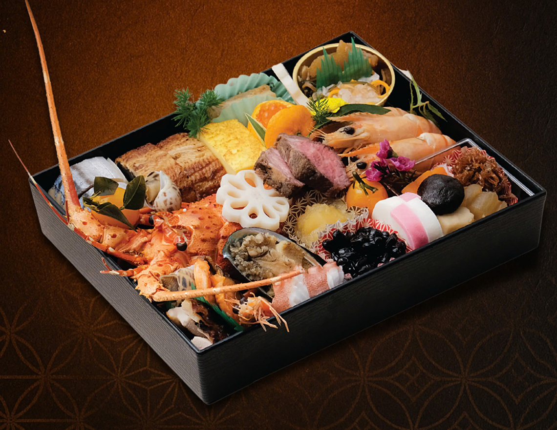 伊勢海老、あわび煮、うなぎ棒寿司、〆さば棒寿司、牛カルビステーキ、金柑の甘露煮、栗きんとん、海老の芝煮、いたわさ、いくら醤油漬け、バイ貝煮つけ、地鶏山椒焼き、酢蓮根、たたきゴボウ、野菜煮、黒豆甘露煮、鮭塩焼き、ちりめん山椒、数の子、紅白なます、タコぶつ