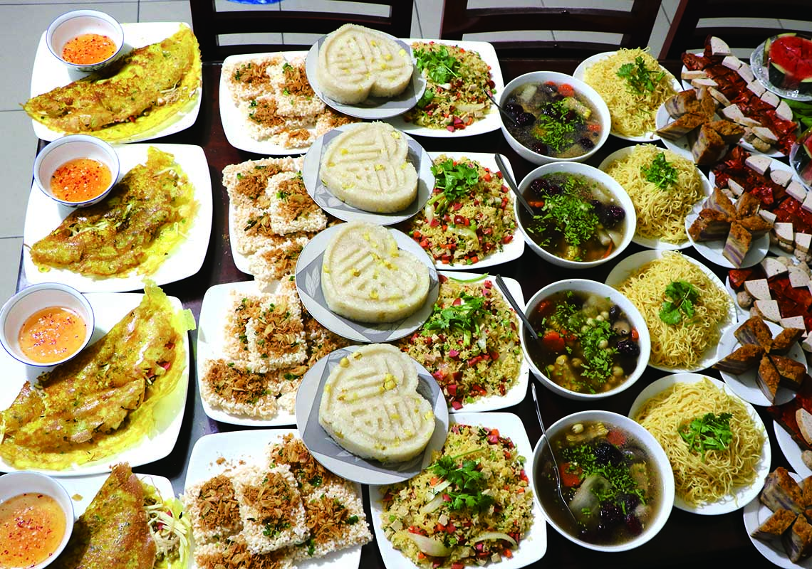ホーチミン市では、法事での食事で大き目のバインセオが並ぶことも
