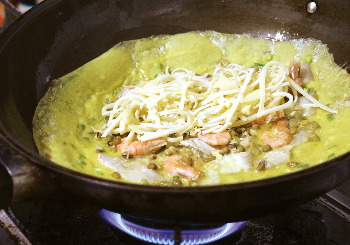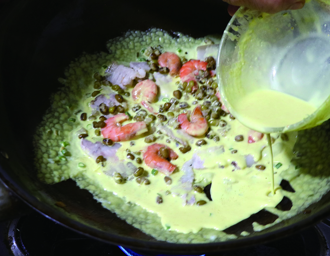 バインセオは、なんといっても焼き加減が大切だ。そのためにまず、生地は30分~1時間ほど休ませると、米粉に水分がなじんででんぷんが膨らみ、焼いても硬くならず、カリッと長持ち。鍋は熱々にしてから生地を流すことがコツだ。温度が低いと、くっついてパリッとした焼きあがりにならない。