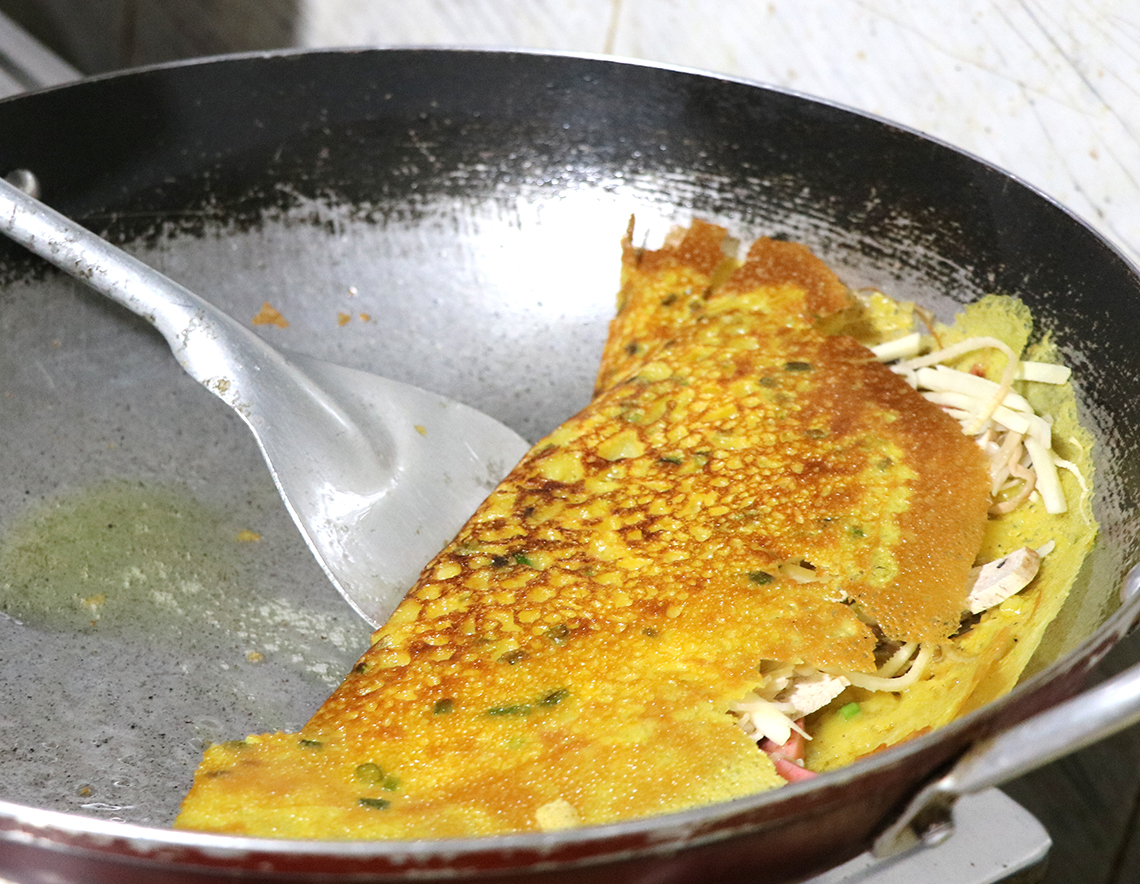 鉄製の大鍋を熱し、少量の油を加え、生地を薄く広げる。ここに炒めた具材を加え、蓋をして蒸す。仕上げにこんがり焼き上げて二つ折りにする