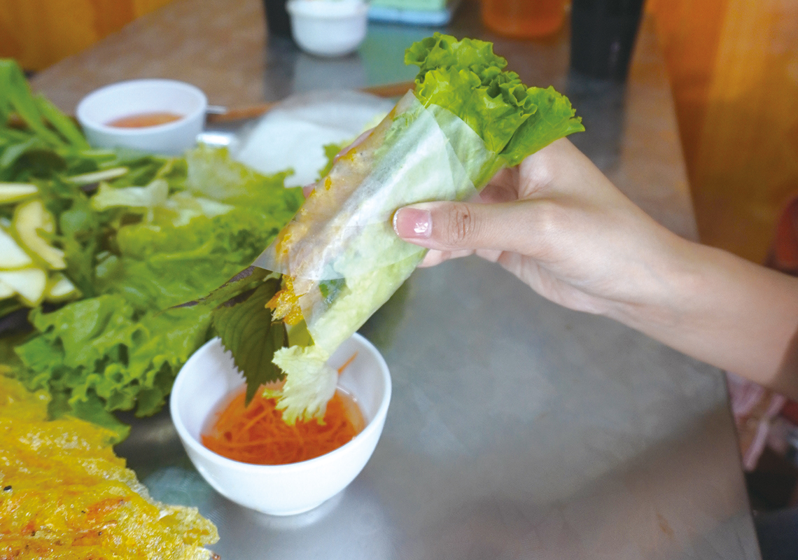 バインセオは熱々がいちばん! 焼き上がったらすぐに手でちぎり、タレにつけてほおばろう。箸を使わず、手で食べることで、生地の質感までしっかりと楽しめる。ライスペーパーや野菜で包むときは、ギュッとしっかり巻くのがコツ。バインセオの生地と野菜や香草がよくなじむ。いろんな食べ方を試してみよう。