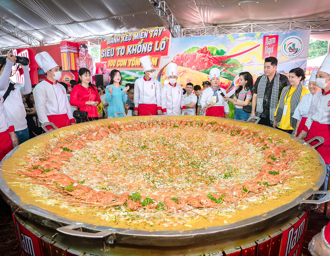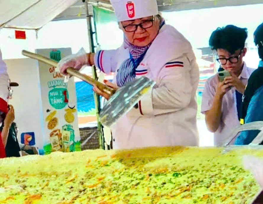 バインセオのすばらしさを国内外に伝えたいと、とんでもなく大きなバインセオを作ってしまった料理人がいる。2025年4月6日にカントー(Cần Thơ)で開催された「南部民間菓子フェスティバル/Lễ Hội Bánh Dân Gian Nam Bộ」に登場した直径3m、周囲9mの巨大バインセオ作りで、指揮を執った郷土料理研究家のレ・ティ・ホン・ズン(Lê Thị Hồng Dung)さんだ。