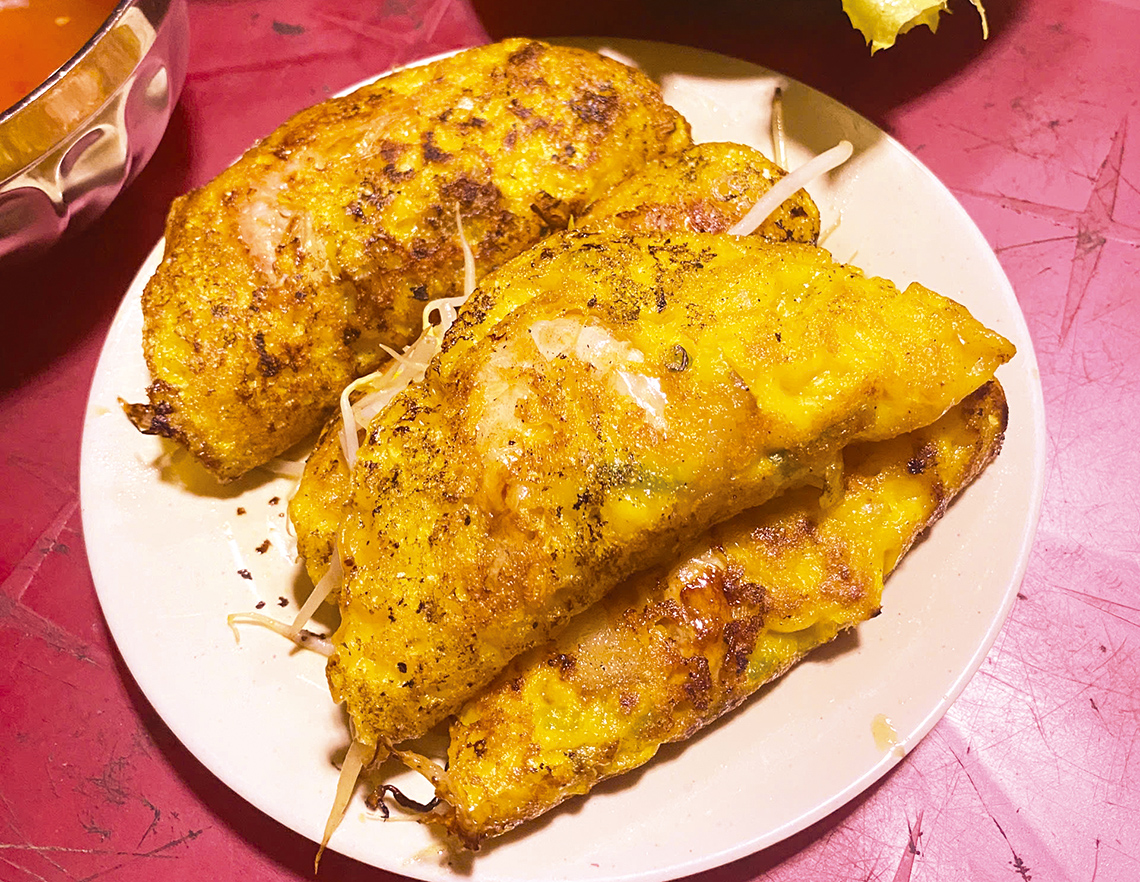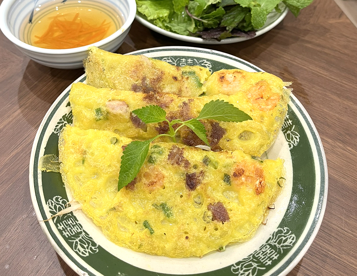 南部のバインセオと言えば、やっぱりメコンデルタ生まれのビッグサイズが印象的だ。コメとココナッツが育つメコンの豊かな大地とおおらかな人々が育んだこの料理は、見た目も味もごちそう感たっぷり。生地は薄くサクサクで、たっぷりの香草の緑やタレの赤が映えて、食べる前からワクワクが止まらない。しかも、ココナッツミルク×ターメリックのコンビが消化も助けてくれる。