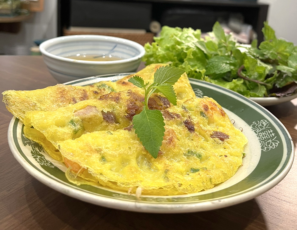 大きなバインセオを家族や友人とわいわいシェアしながら味わう楽しさもあれば、好きな具材を自由に選んで自分だけの1枚も作れるおもしろさもある。南国での生活のように、のびのびと豪快で、でもほっとする味わいがそこにある。