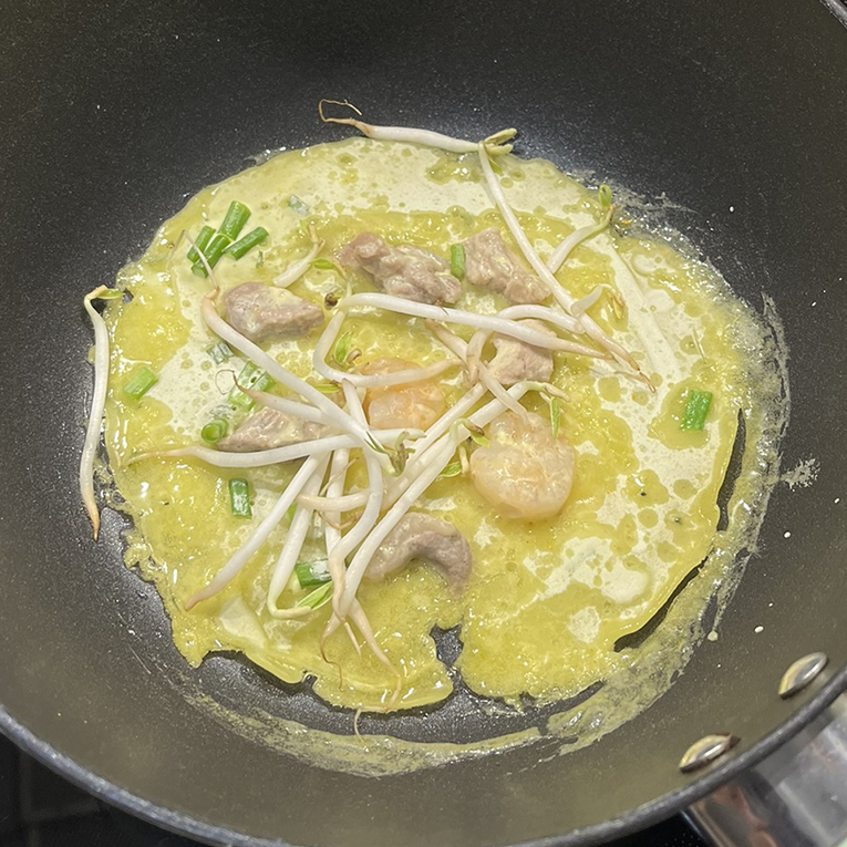 ④生地を焼く 少し深めのフライパンに少量の油をなじませ、具材を入れて軽く炒める。生地を流し入れて薄く広げ、モヤシを加える。ふたをして中火で2〜3分蒸し焼きにし、その後ふたを外してさらに2〜3分、両面をカリッとなるまで焼く。お玉を使って生地を半分に折りたたむ。