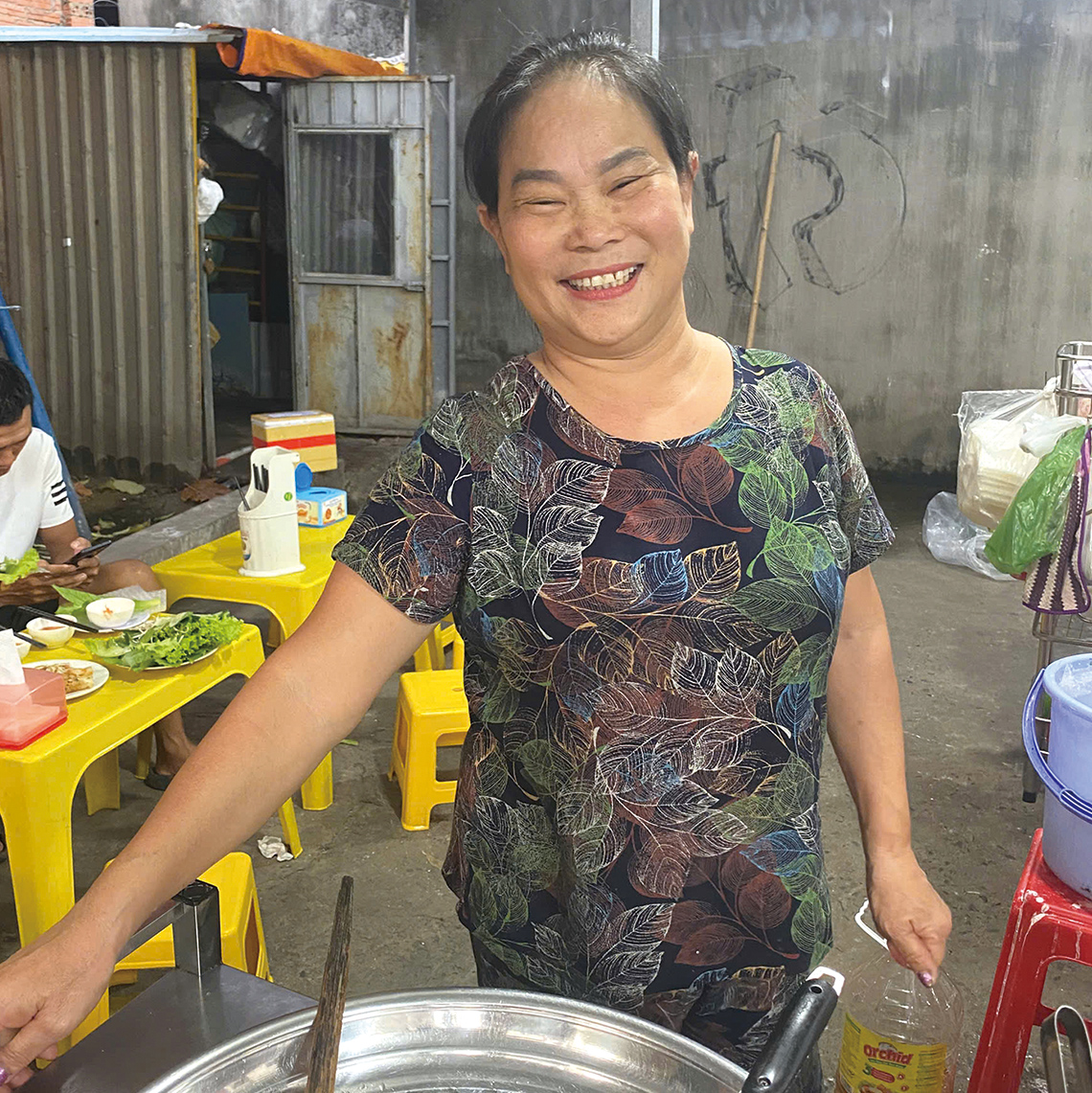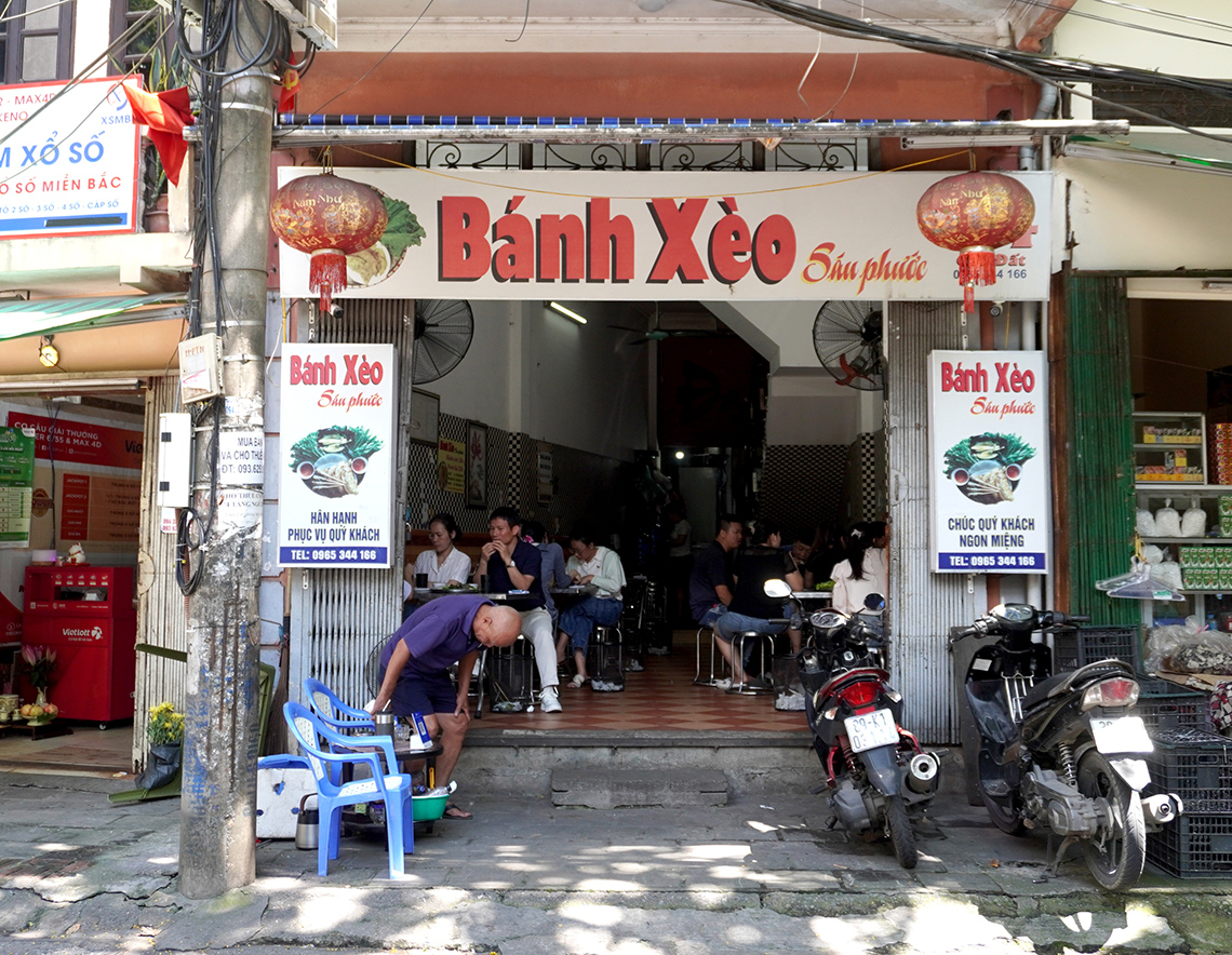 メコンデルタ出身マジシャンの故郷の味 ティエンザン(Tiền Giang)省出身のサウ・フオックさんが営む店。独自に配合した粉で作るバインセオは薄くカリッと香ばしく、油っぽさがなく軽やか。直径20cmのバインセオを、食べやすく半分にカットしてくれる。甘酸っぱいヌックマムのタレは、北部の味覚に合わせて甘すぎない仕上がりだ。