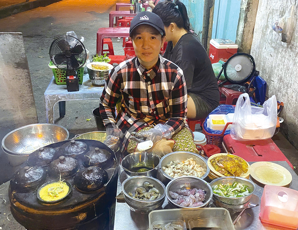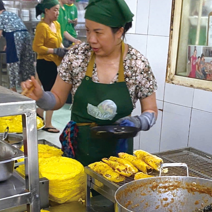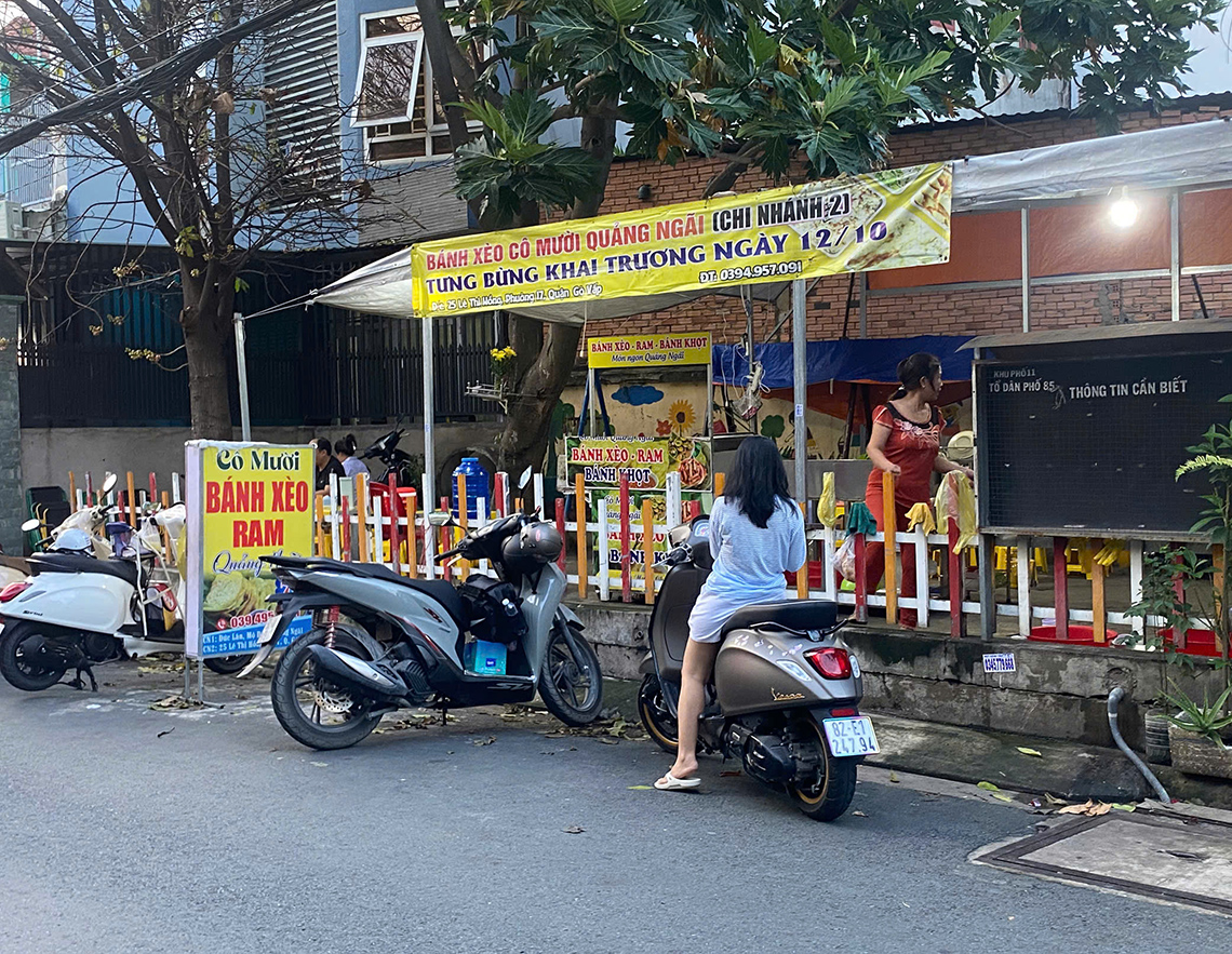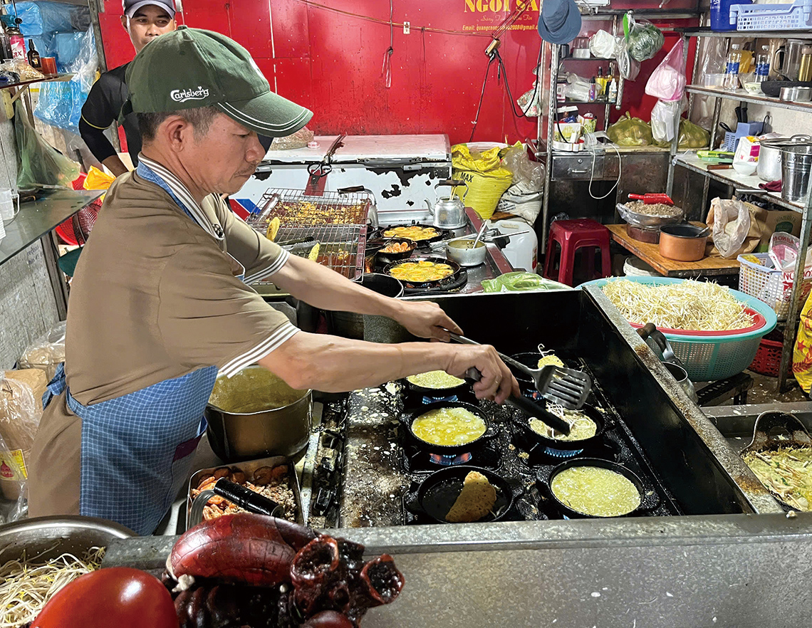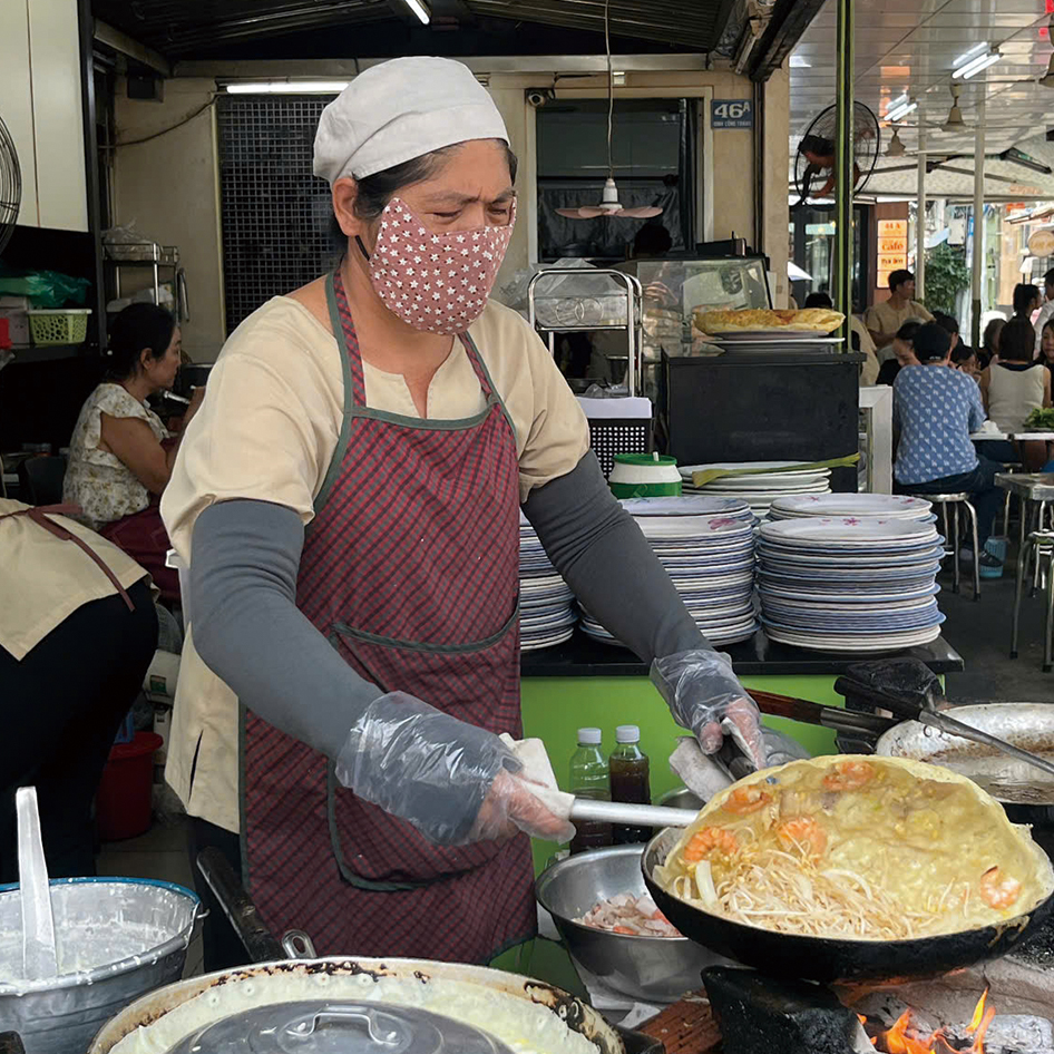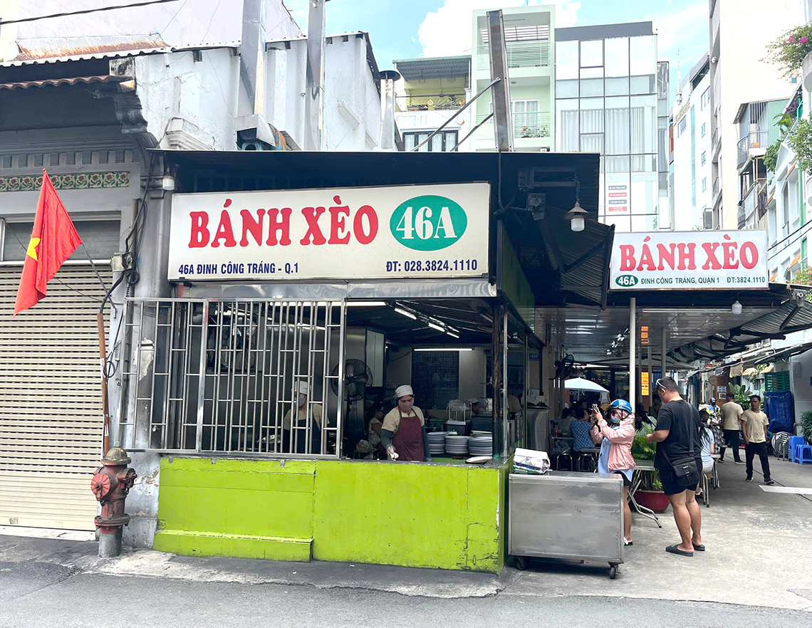 1945年創業で三代続く、ガイドブックでもおなじみの店。新鮮な米粉とココナッツミルクで作られた生地は自然な甘みがあり、パリっとした焼き上がり。添えられたたっぷりの野菜でバインセオを巻くのが店のおすすめの食べ方だ。