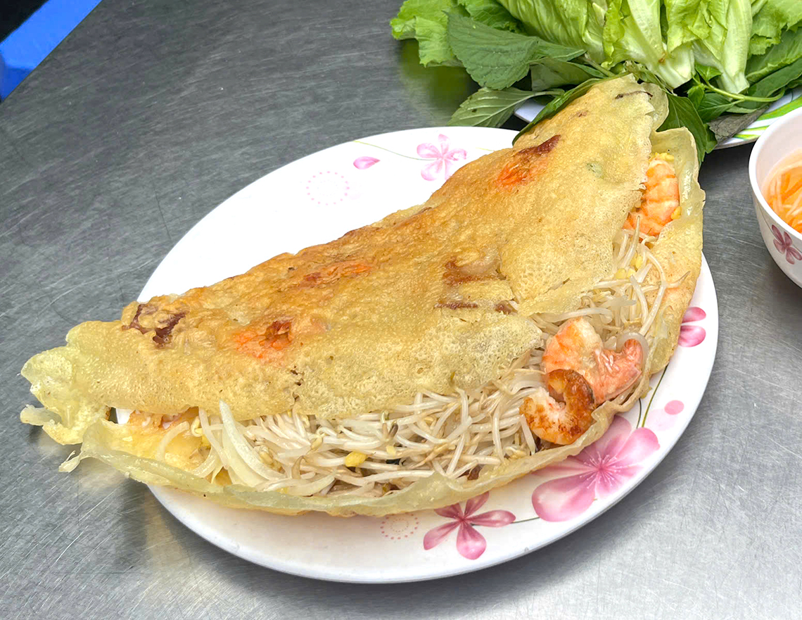 ダナンで40年近く続く老舗バインセオ店。炭火で香ばしくパリッと焼き上げた生地に、大きめの海老や牛肉、もやし、卵、青ねぎがたっぷり。大きさは直径20cmほどで、半分にカットした状態で供される。ライスペーパーで香草と一緒に巻いて、ピーナッツとゴマ入りの濃厚なレバーソースで味わう。