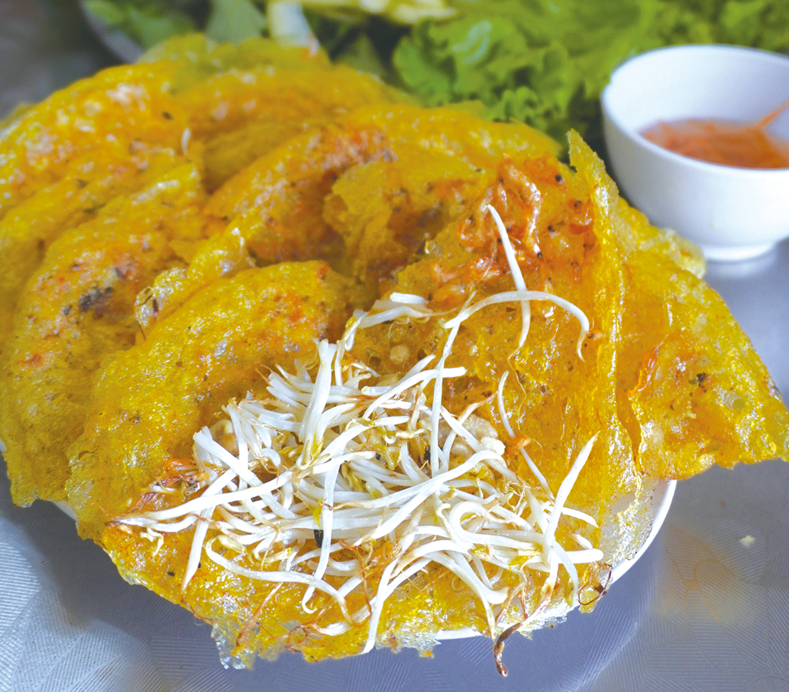 海沿いの街では、エビやイカなどの新鮮な魚介がたっぷり。生地は白く、厚めで柔らかく、油が多めでジューシー。1975年以降、多くの中部風バインセオが南部へと伝わり、今やホーチミン市にも多くの専門店がある。