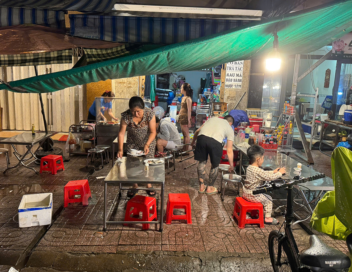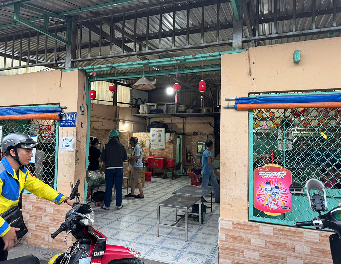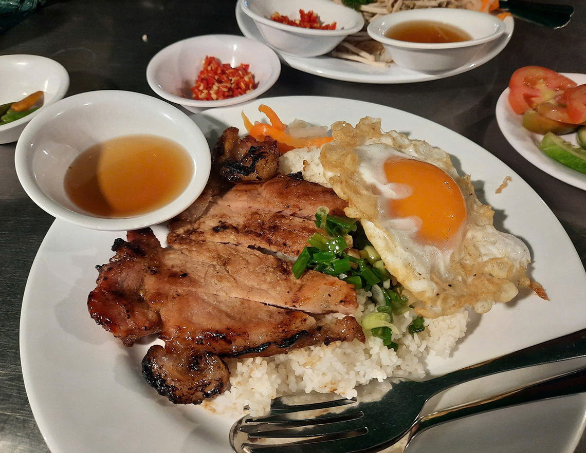 「コムタム」とは、本来、精米の際に生じる砕けた米を炊いたくずれ米ごはんのことで、広義でおかずを組み合わせた庶民の定食のことを指す。創業当初、ソムチウ(Xom Chieu)市場正門前のゴミ集積場近くに店があったためこの名が付き、市場裏の歩道沿いに移転した今でもそう呼ばれている。メニュー表はないので、注文前に価格を確認しておこう。