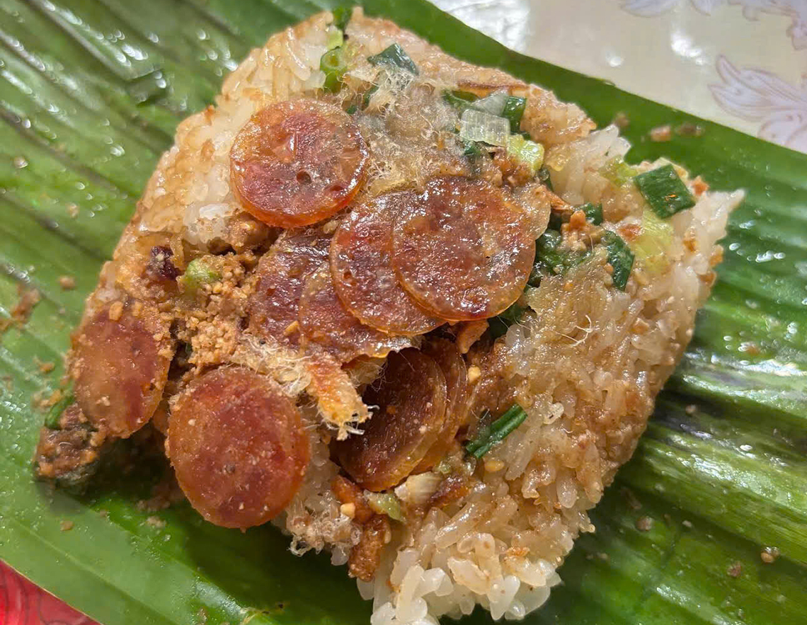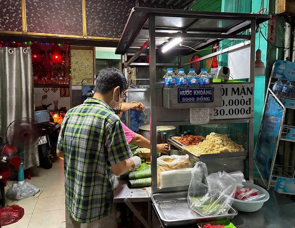 5区のチャンフー(Tran Phu)通り沿いの、葬儀場が2軒並ぶ場所にあった屋台。周辺では紙銭や葬祭サービスを営む人が多く、通りの特徴から名付けられた店名だ。メニューは1種類のみで、具材は揚げネギ、中華ソーセージ、豚肉のでんぶ。熱々でモチモチしたおこわに、ねぎ油と秘伝の醤油だれがかかり、炒って砕いたピーナッツが香ばしさを添えている。