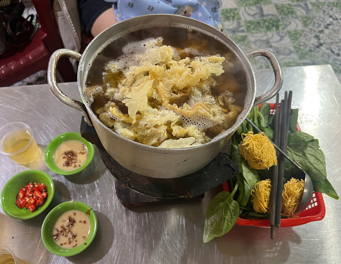 小さな墓地のすぐそばにあることから名付けられた牛鍋の店。その名前が話題を呼び、多くの客が興味本位で訪れる人気店となった。次第に看板すら必要なくなり、取り外されるほどの有名店に。客が来ると、炭火コンロの上に厚手の鉄鍋を置き、牛肉、スジ、軟骨、タロイモ、豆腐などを入れた骨スープがグツグツと煮立ち始める。牛鍋は(2人前)17万VND~。