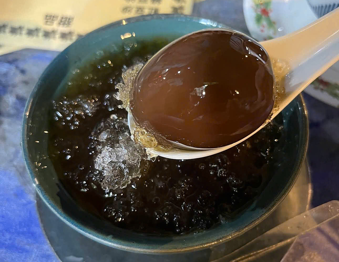 人気メニュー「鶏卵茶/Tra Hot Ga」2万2000VND。ゆで卵をお茶と砂糖で煮込み、白身はまろやかで臭みがなく、ほんのりとした甘みとお茶の香りが感じられる一品