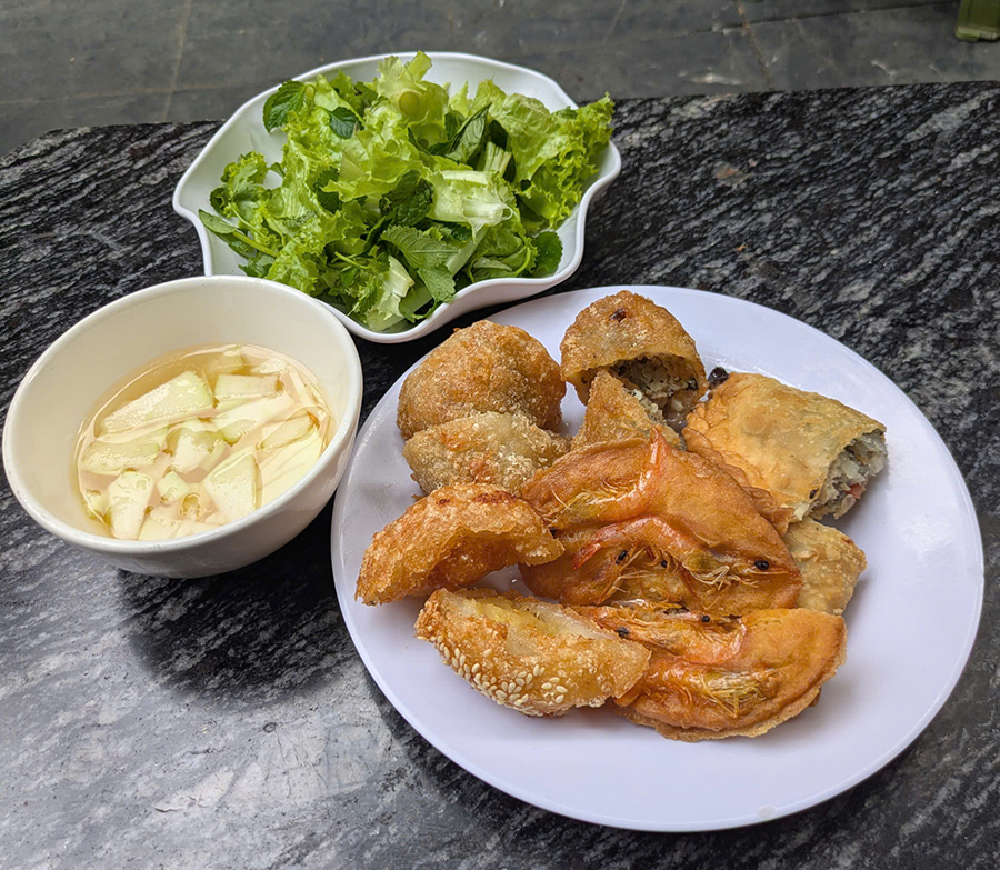 創業30年以上の揚げ物専門店。海老のかき揚げ「バイントム/Banh Tom」、揚げ餃子「バインゴーイ/Banh Goi」など、食べ応えたっぷりのスナック(1個6000~1万5000VND)が大人気だ。