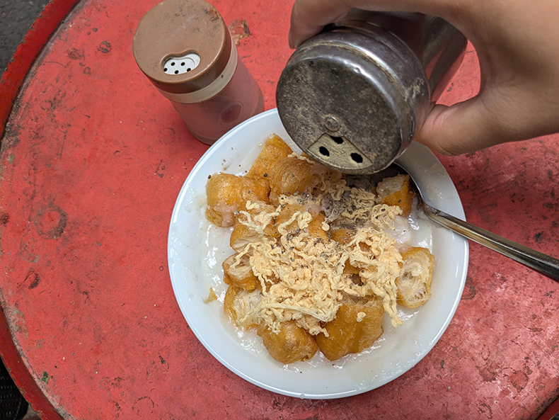 砕いたお米を豚骨スープでじっくり煮込んだお粥に、柔らかく煮たスペアリブや旨みたっぷりの豚肉フロス、揚げパンを添えた、体がほっと温まる1杯(2万VND~)。
