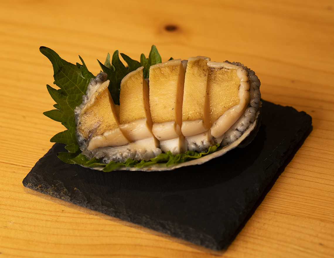 63℃の低温で蒸したベトナム産鮑を、旨味たっぷりの肝ソースで。