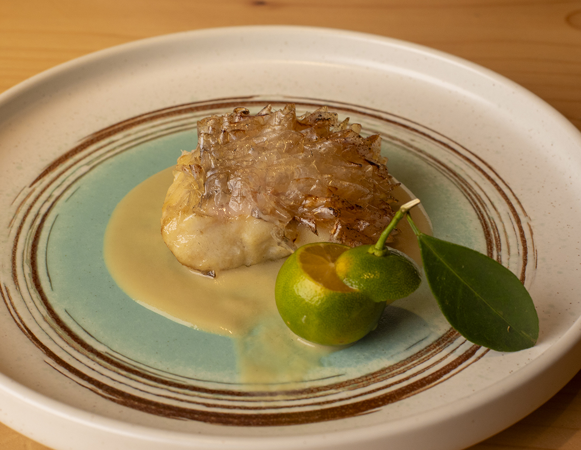 逆立てた鱗のパリパリ感と、茄子のソースが絡み合う「甘鯛の鱗焼き」