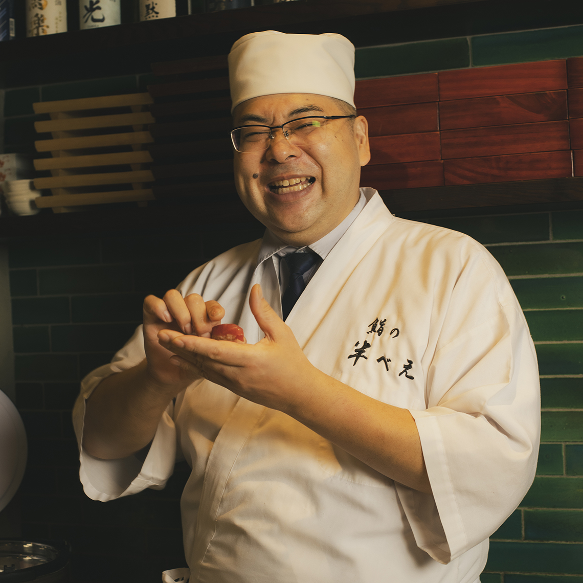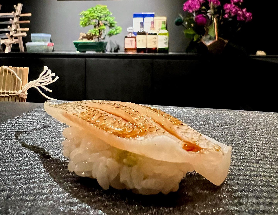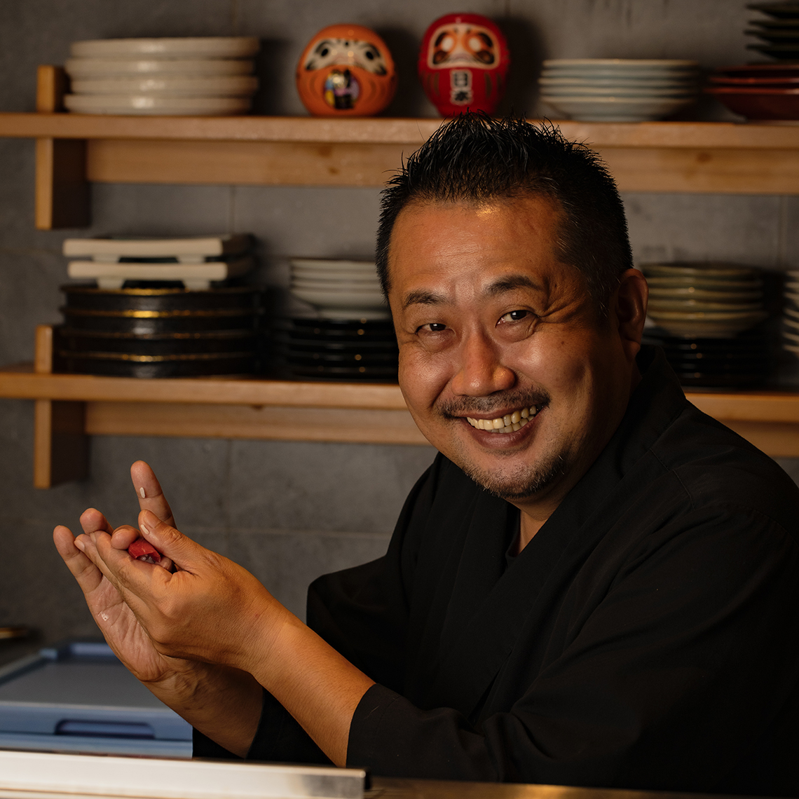Chef's profile 東京の老舗寿司店で約30年腕を磨いた大将、市来成人さん。江戸前の所作と仕込みを基礎に、日本から直接仕入れる旬のネタを生かした料理で口福を届ける