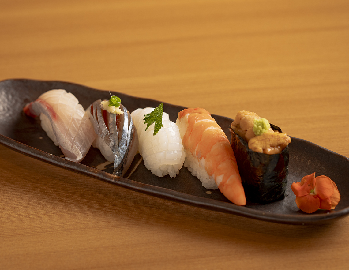 Chef's profile 大将の大柄根毅さんは、東京・銀座の江戸前寿司店や、圧しすしの老舗・大阪「小鯛雀鮨すし萬」で修業を積んだ。確かな手仕事と、一人客にも程よい距離感で寄り添う。四季の走りを逃さず、江戸前の勘所を日本とベトナム各地の食材で端正に表現する