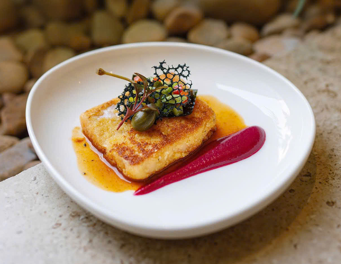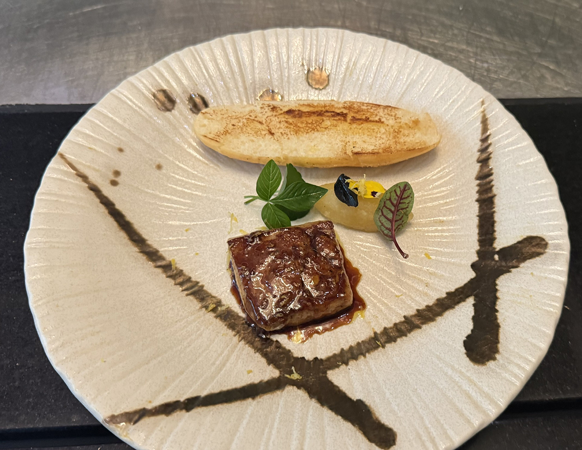 料理長のデイビッド・ターイさんは35年以上の経験を持つベテラン。ベトナム系華人としてパリで育ち、6歳から料理の世界に親しんできた。代表作の「フランス産フォアグラの鉄板焼き」は、外は香ばしく中はとろけるような食感。ワインとリンゴソースが、濃厚な味わいに爽やかさを添え、絶妙なバランスを引き立てる。