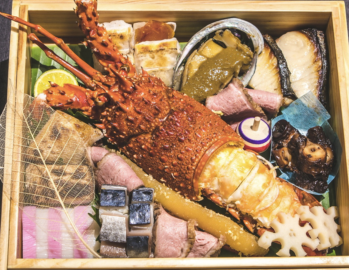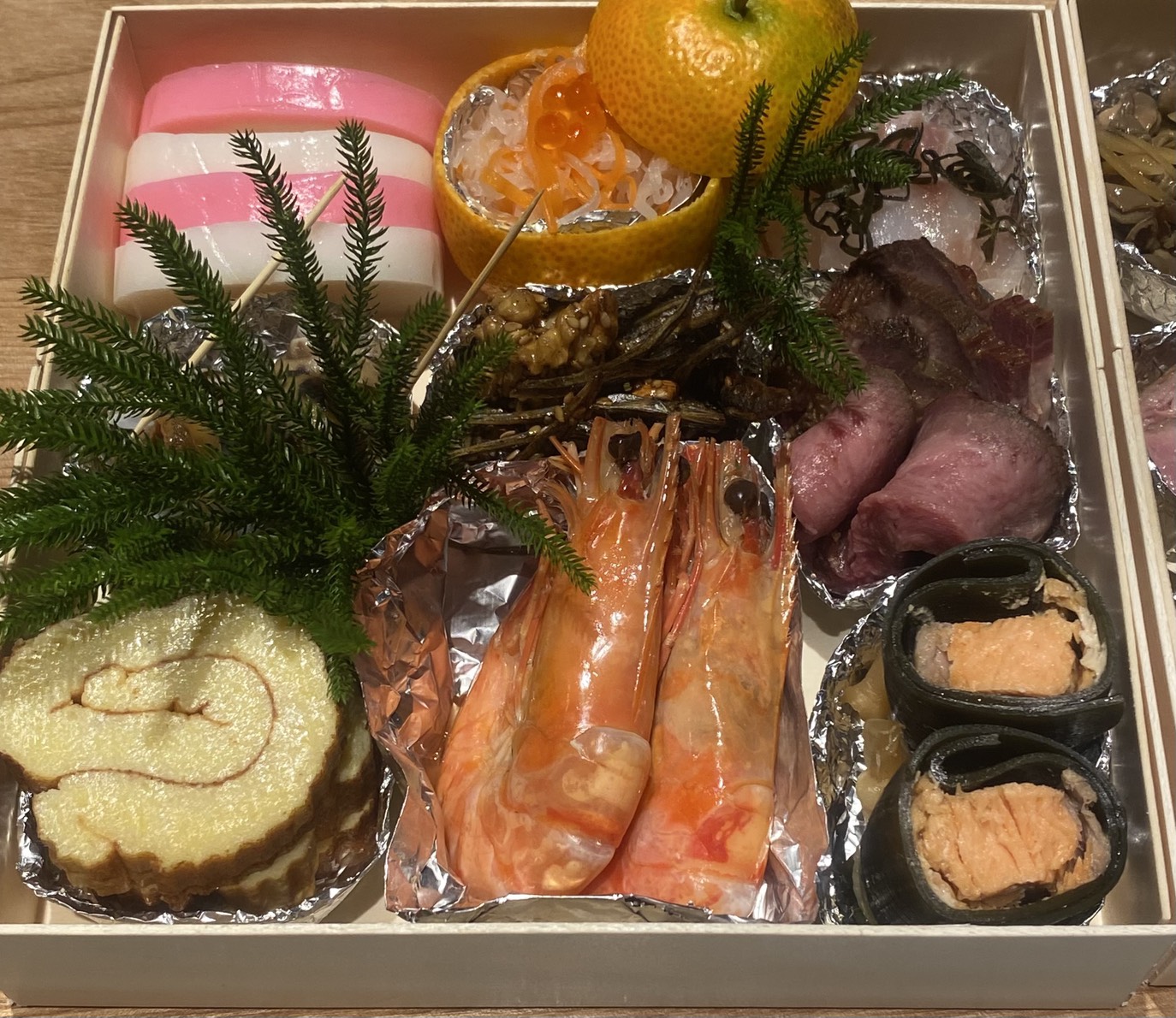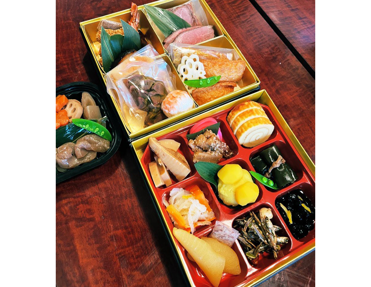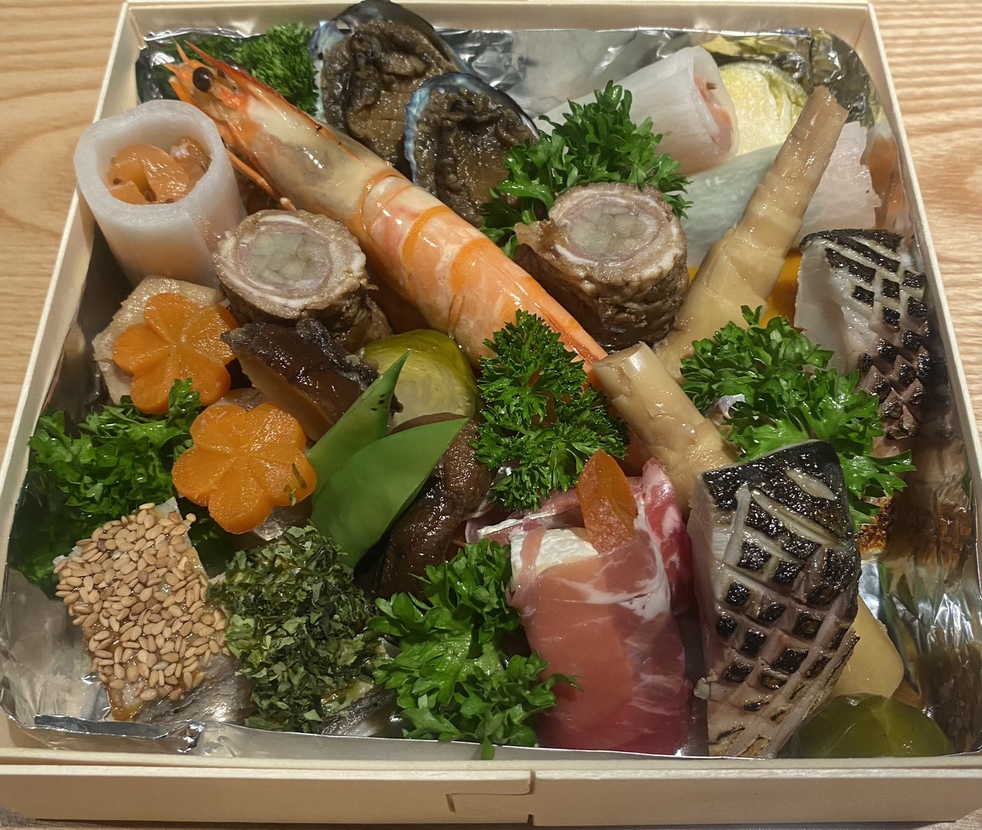自家製味付け数の子/味付けイクラ/栗の渋皮煮きんとん/日本産片口イワシとナッツの田づくり/自家製黒豆煮/銀だら西京焼き/エビの白胡麻揚げ/自家製伊達巻/自家製ローストビーフ和風ソース/フランス産カモのロースト/北海道産昆布巻きの煮物/たけのこ土佐煮/たたきゴボウ/砂肝の燻製のオイル漬け/手綱こんにゃく、自家製鶏モモのスモーク/紅白なます/紅白かまぼこ/塩サバの自家製スモーク/酢レンコン/自家製お煮しめ/手まり寿司