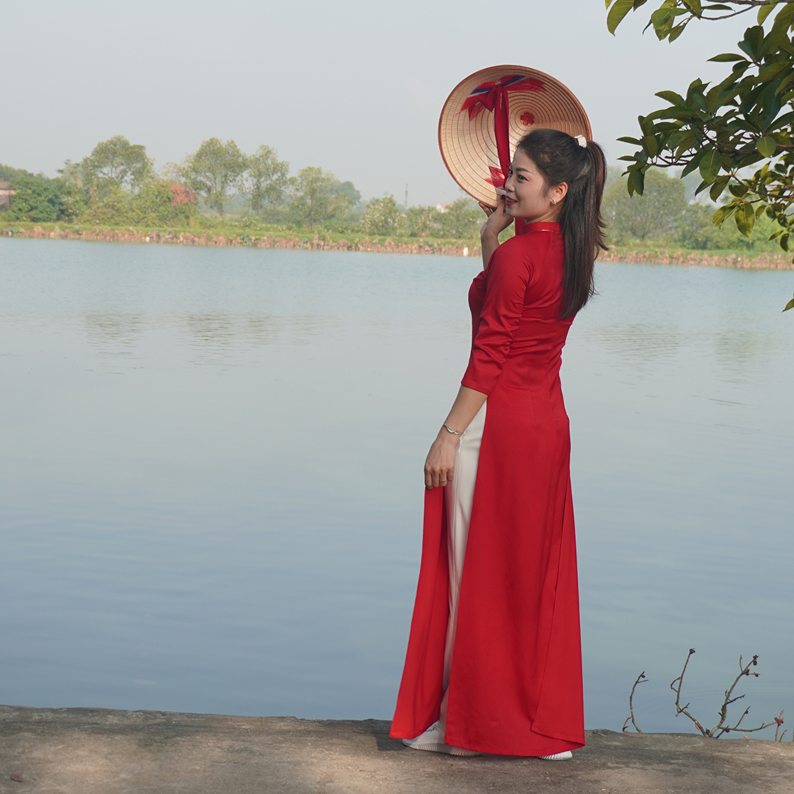 アオザイ(Áo Dài)。丈の長いチュニックとパンツの衣装で、体にフィットするデザイン。結婚式や卒業式、旧正月テト(Tết)などで着られる。白いアオザイを女生徒の制服としている高校も多いんだよ。