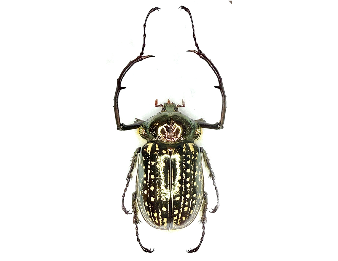 体長5~6cmの美しい模様の巨大なコガネムシの仲間。オスはとっても長い前足をもっているよ