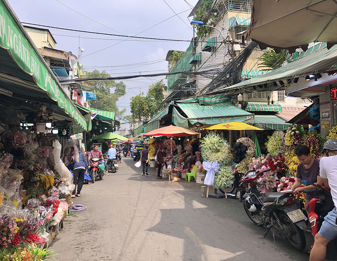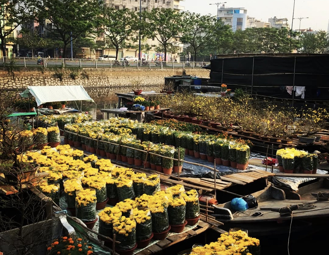 旧8区トウフー・ベンゲー(Tau Hu – Ben Nghe)運河沿いにあるこの花市は、テト期間のみ開かれる。マリーゴールド、キク、梅、ケイトウなど、ハウザン(Hau Giang)省やヴィンロン(Vinh Long)省などから運ばれてきた、色とりどりの花を積んだ舟が運河を行き交う。川とともに歴史を築いてきたベトナム南部ならではの光景が、メコンデルタの豊かな風土を感じさせてくれる。